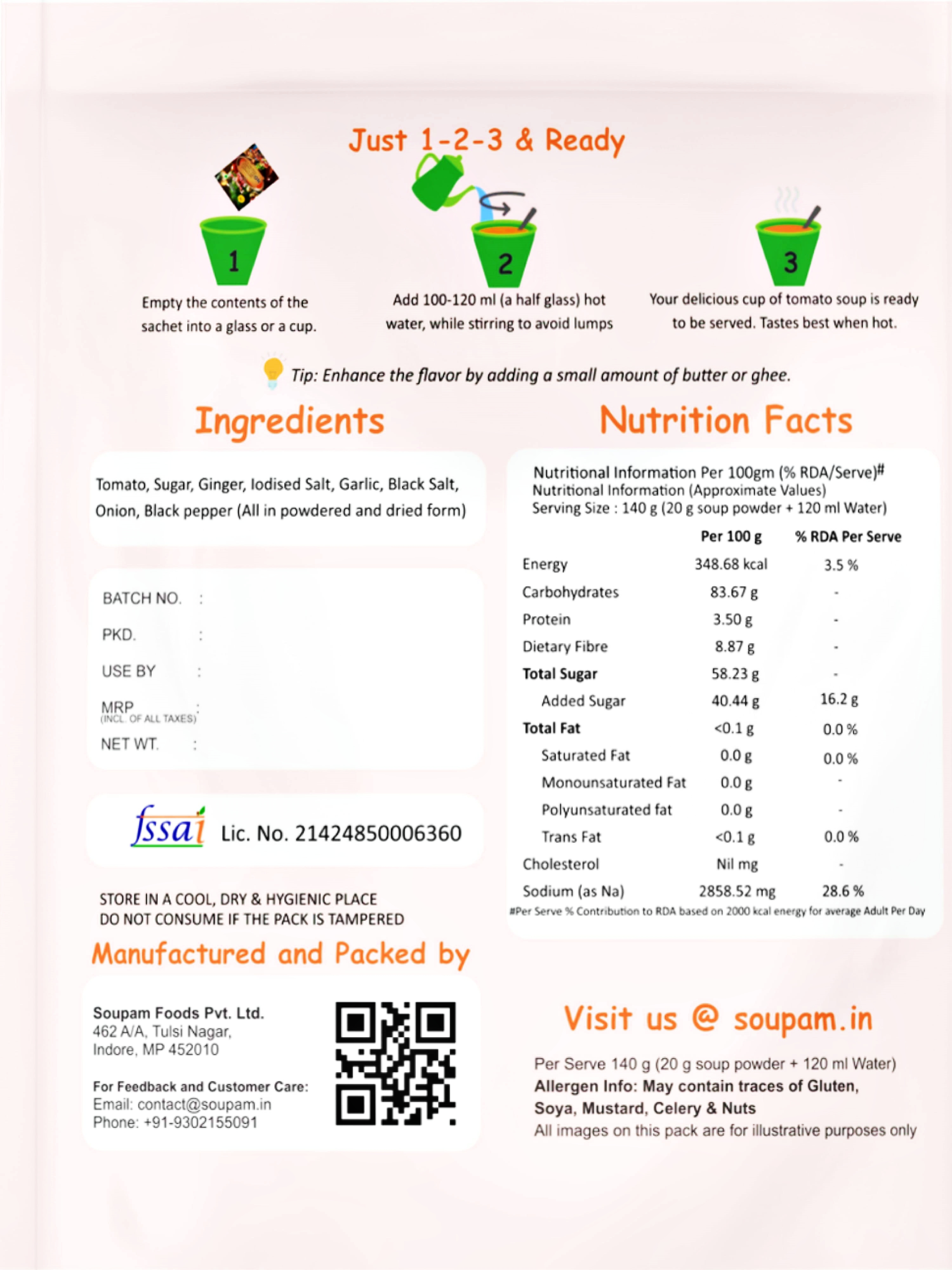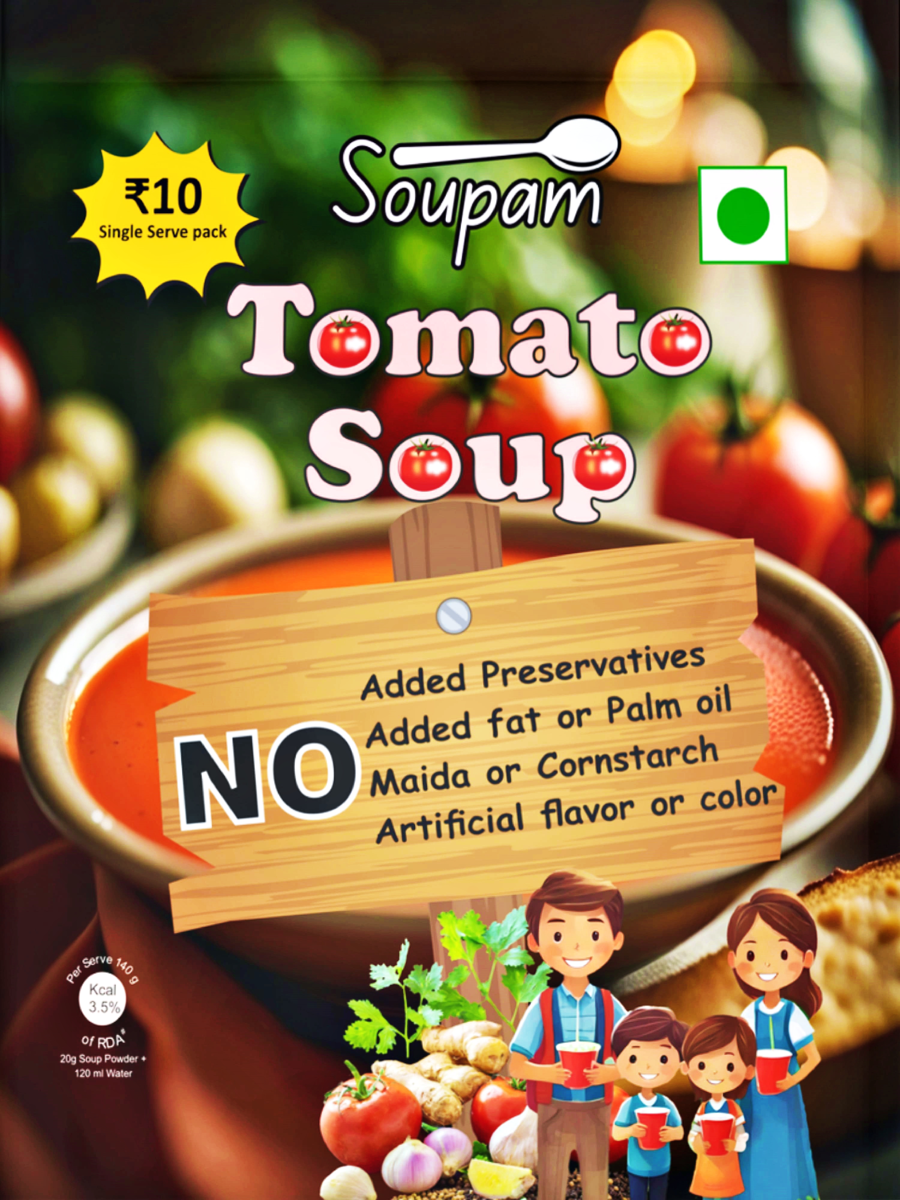 After taking some time to reflect and learn, we returned to the mission with renewed energy. With the support of our friends and mother's recipe, we founded Soupam and launched our first product—instant tomato soup.